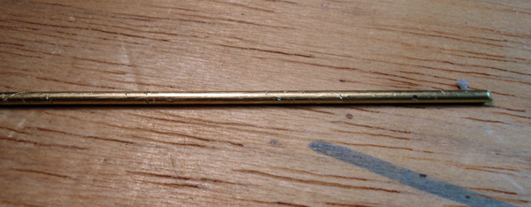 Tout d’abord, j’esquinte volontaire une tige en laiton. Le but est de créer des entailles et des rayures, afin que la première couche de pâte adhère mieux. Je viens ensuite poser du Brow Stuff (du green irait aussi tout à fait mais je n’avais que ça sous la main).